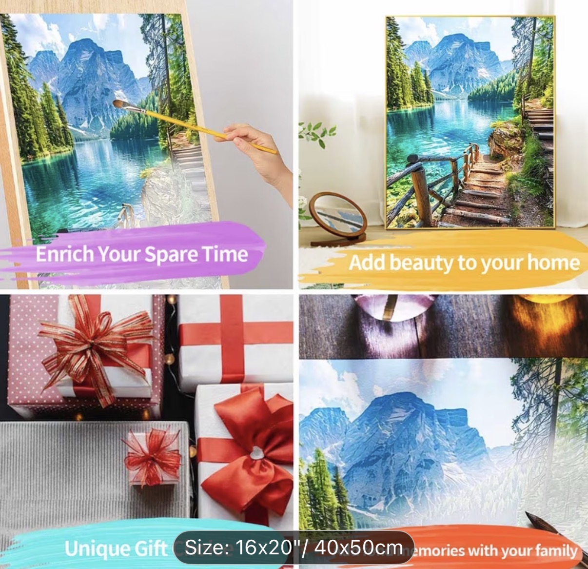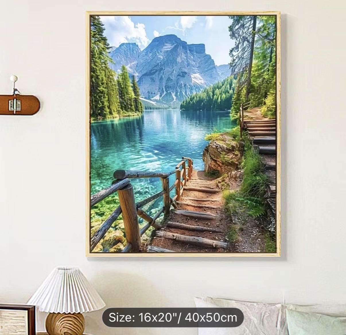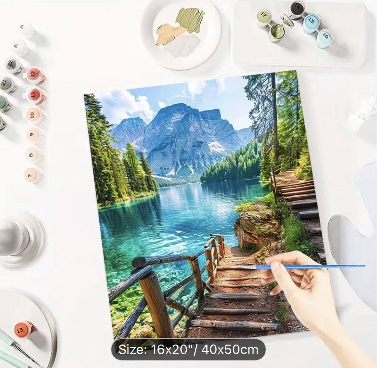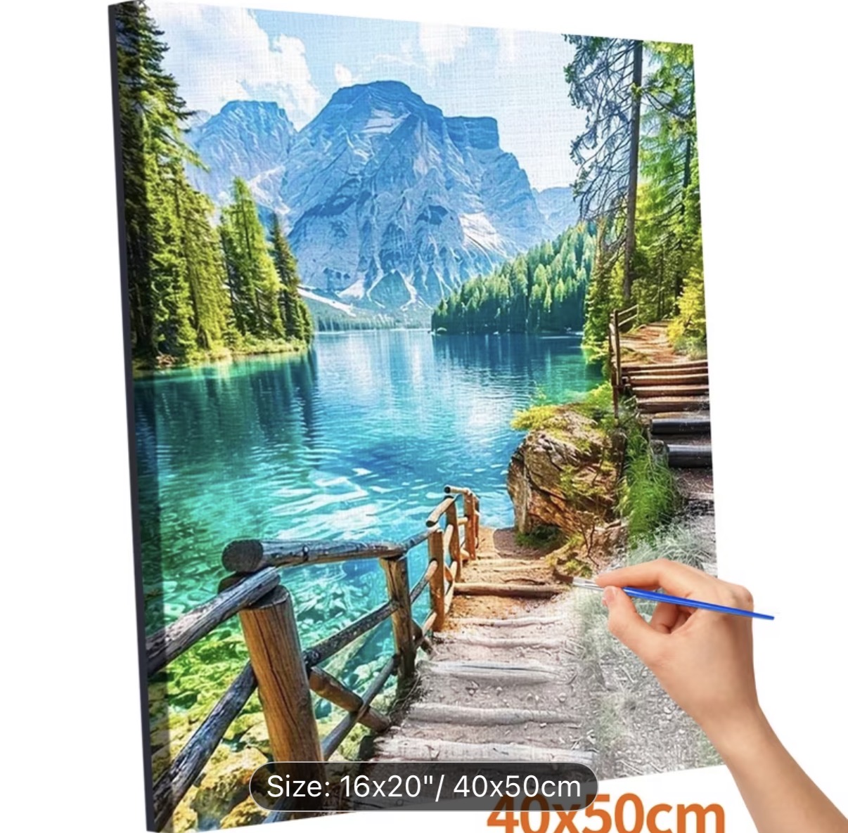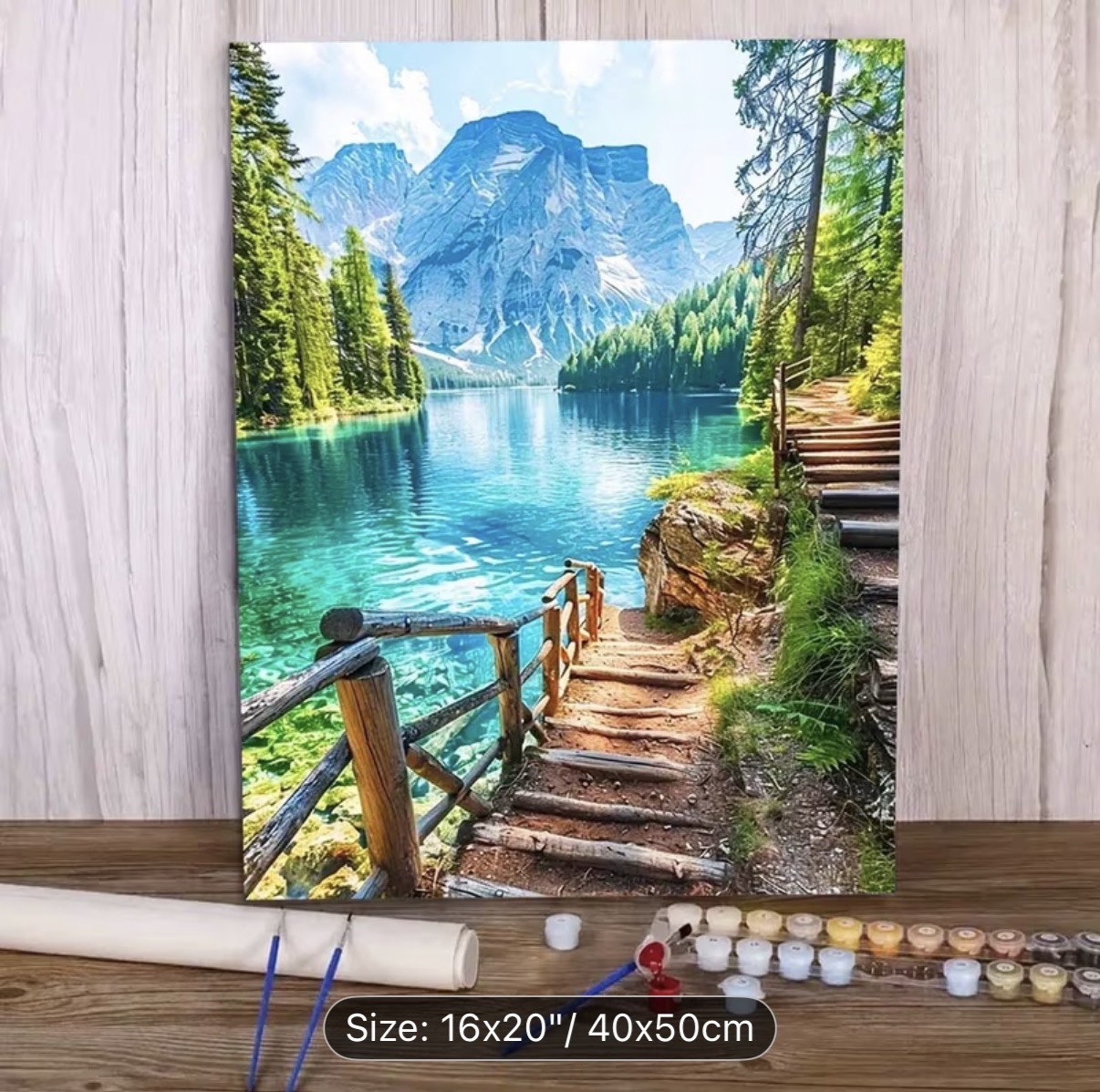 این نقاشی با اعداد (رولی) منظرهای آرامشبخش و الهامگرفته از طبیعت بکر کوهستانی را به تصویر میکشد؛ جایی که دریاچهای زلال با طیفهای فیروزهای و آبی، بازتابی شفاف از کوههای سر به فلک کشیده و جنگلهای انبوه اطراف را در خود جای داده است. مسیر چوبی و پلکان کنار آب، بیننده را به سفری آرام در دل طبیعت دعوت میکند و حس قدمزدن در هوایی پاک و خنک را زنده میسازد.