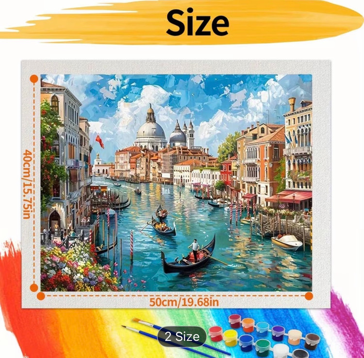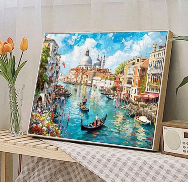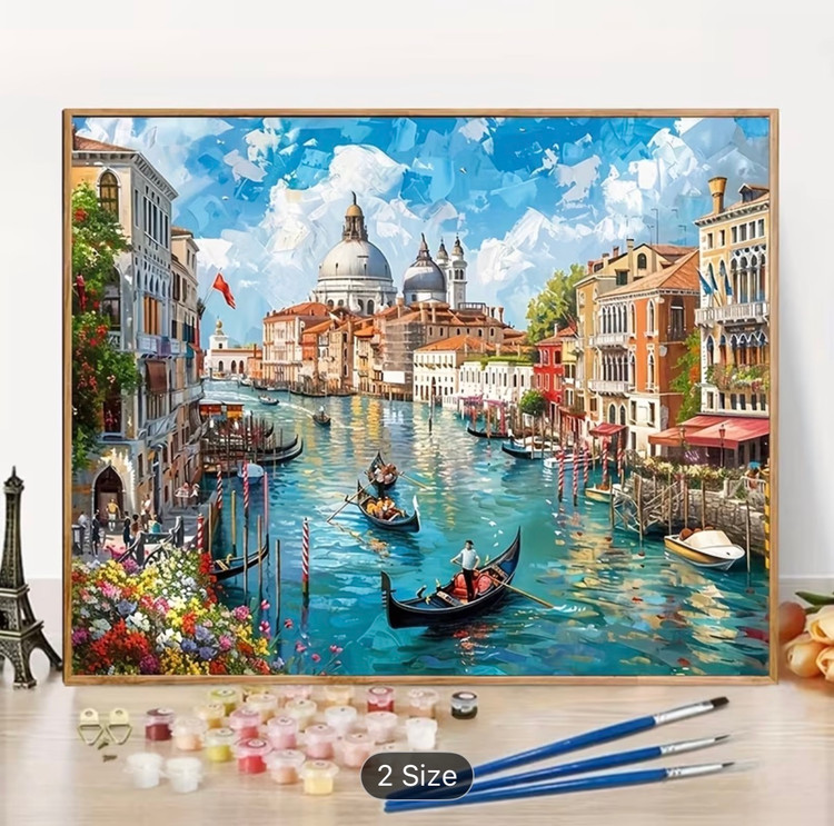 این نقاشی با اعداد، منظرهای زیبا و پرجزئیات از شهر رویایی ونیز را به تصویر میکشد؛ کانال آبی معروف، قایقهای گوندولا، ساختمانهای رنگارنگ تاریخی و آسمانی آبی که حس آرامش و سفر را زنده میکند.