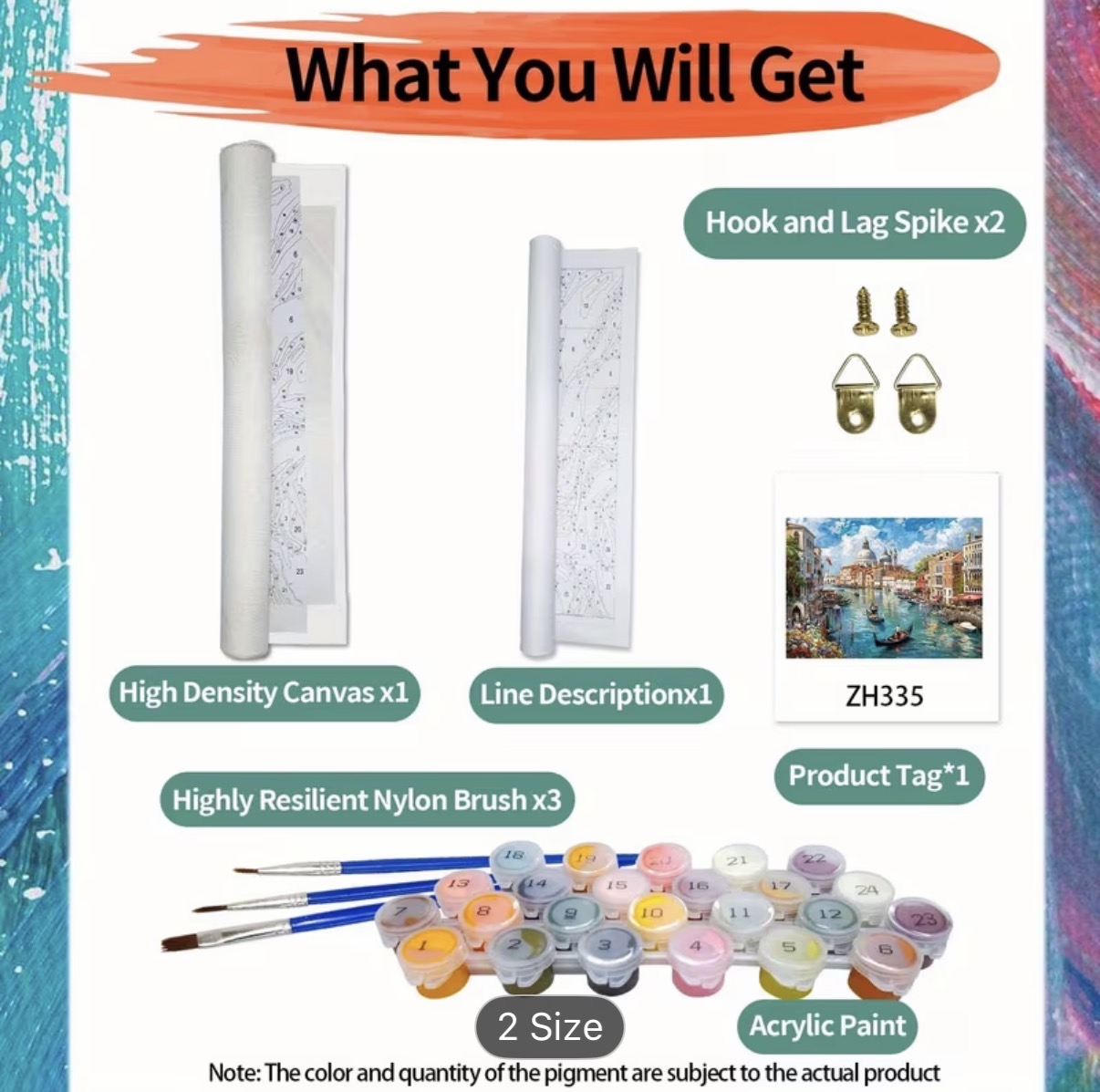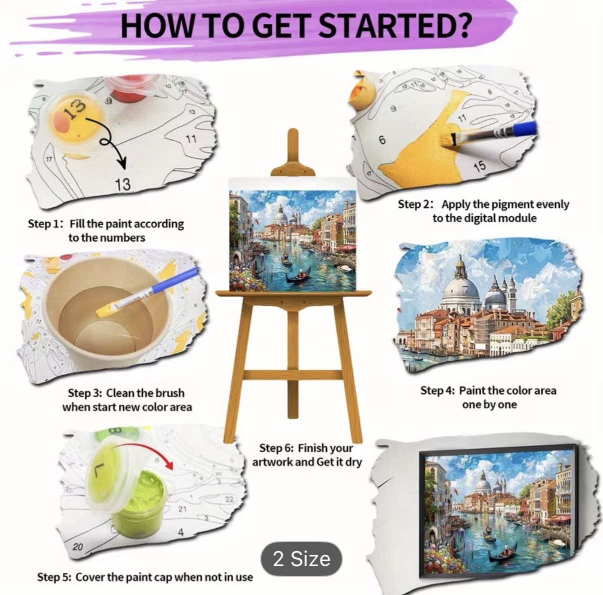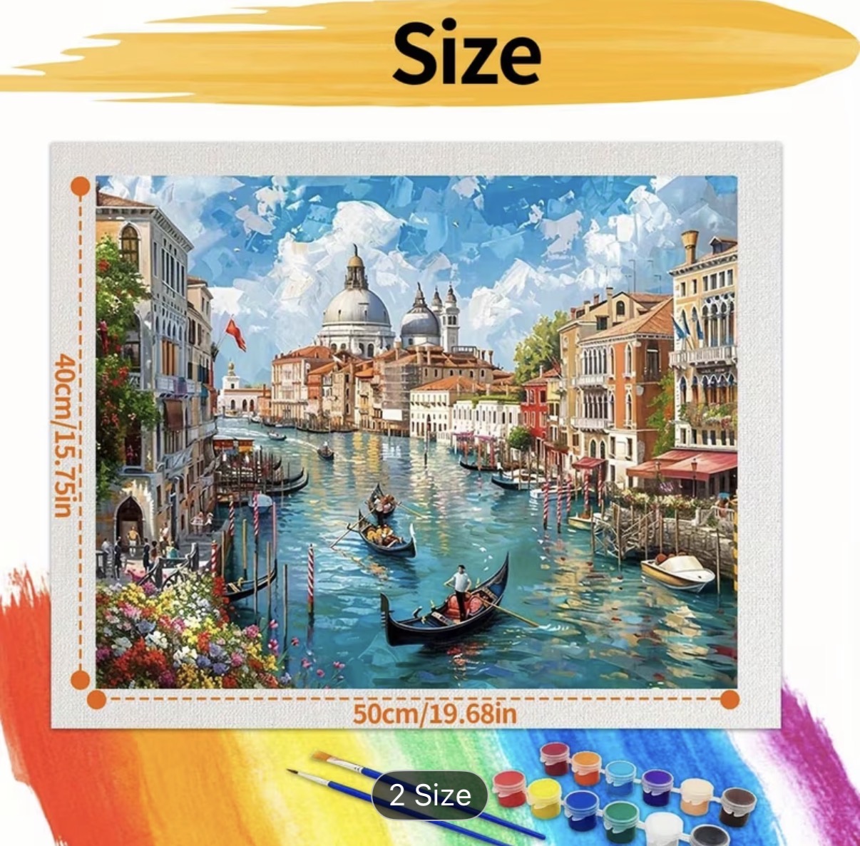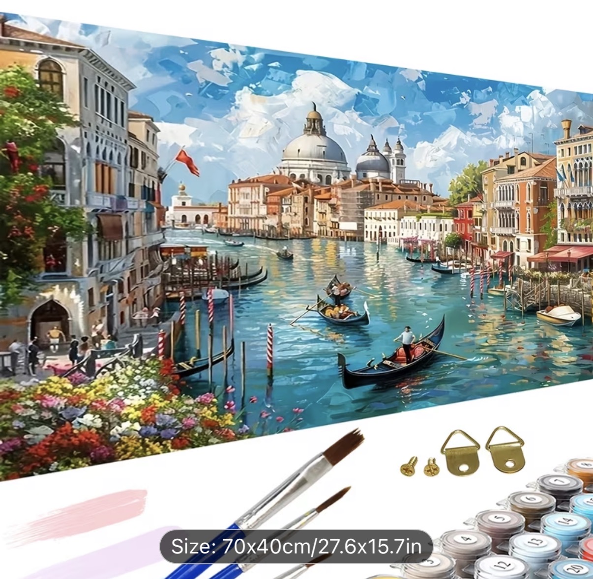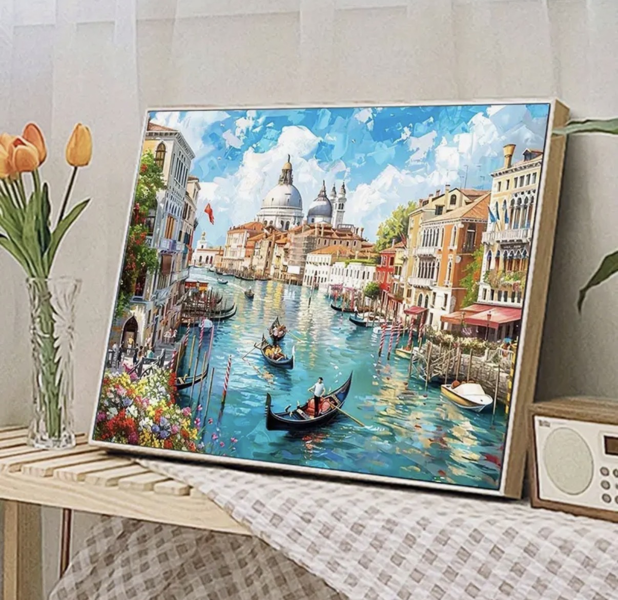 این نقاشی با اعداد، منظرهای زیبا و پرجزئیات از شهر رویایی ونیز را به تصویر میکشد؛ کانال آبی معروف، قایقهای گوندولا، ساختمانهای رنگارنگ تاریخی و آسمانی آبی که حس آرامش و سفر را زنده میکند.