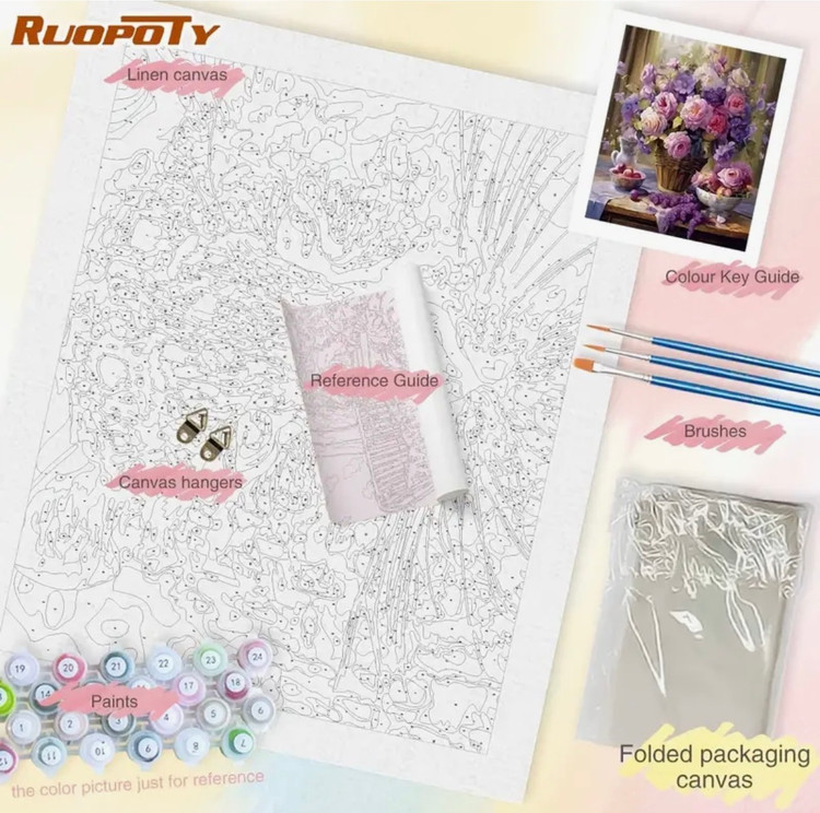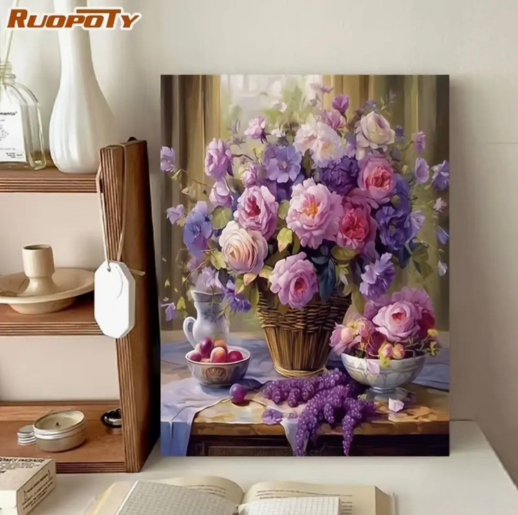 این نقاشی با اعداد، تصویری زیبا و آرامشبخش از سبدی پر از گلهای لطیف به رنگهای بنفش، صورتی و یاسی را به نمایش میگذارد که در کنار چیدمانی کلاسیک و هنری قرار گرفته است. ترکیب رنگهای ملایم و گلهای ظریف، حس لطافت، آرامش و زیبایی طبیعت را به فضا منتقل میکند.