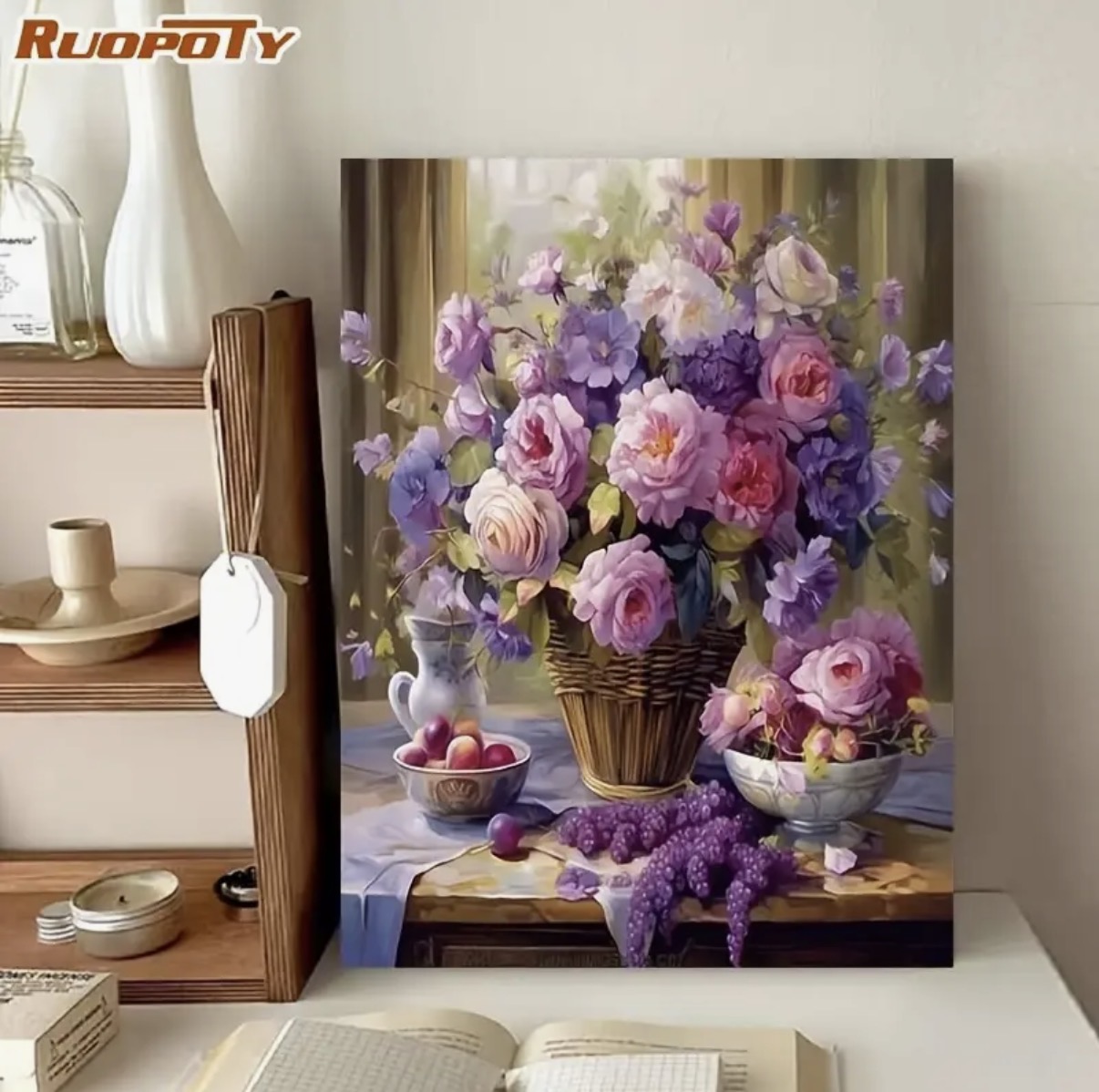 این نقاشی با اعداد، تصویری زیبا و آرامشبخش از سبدی پر از گلهای لطیف به رنگهای بنفش، صورتی و یاسی را به نمایش میگذارد که در کنار چیدمانی کلاسیک و هنری قرار گرفته است. ترکیب رنگهای ملایم و گلهای ظریف، حس لطافت، آرامش و زیبایی طبیعت را به فضا منتقل میکند.