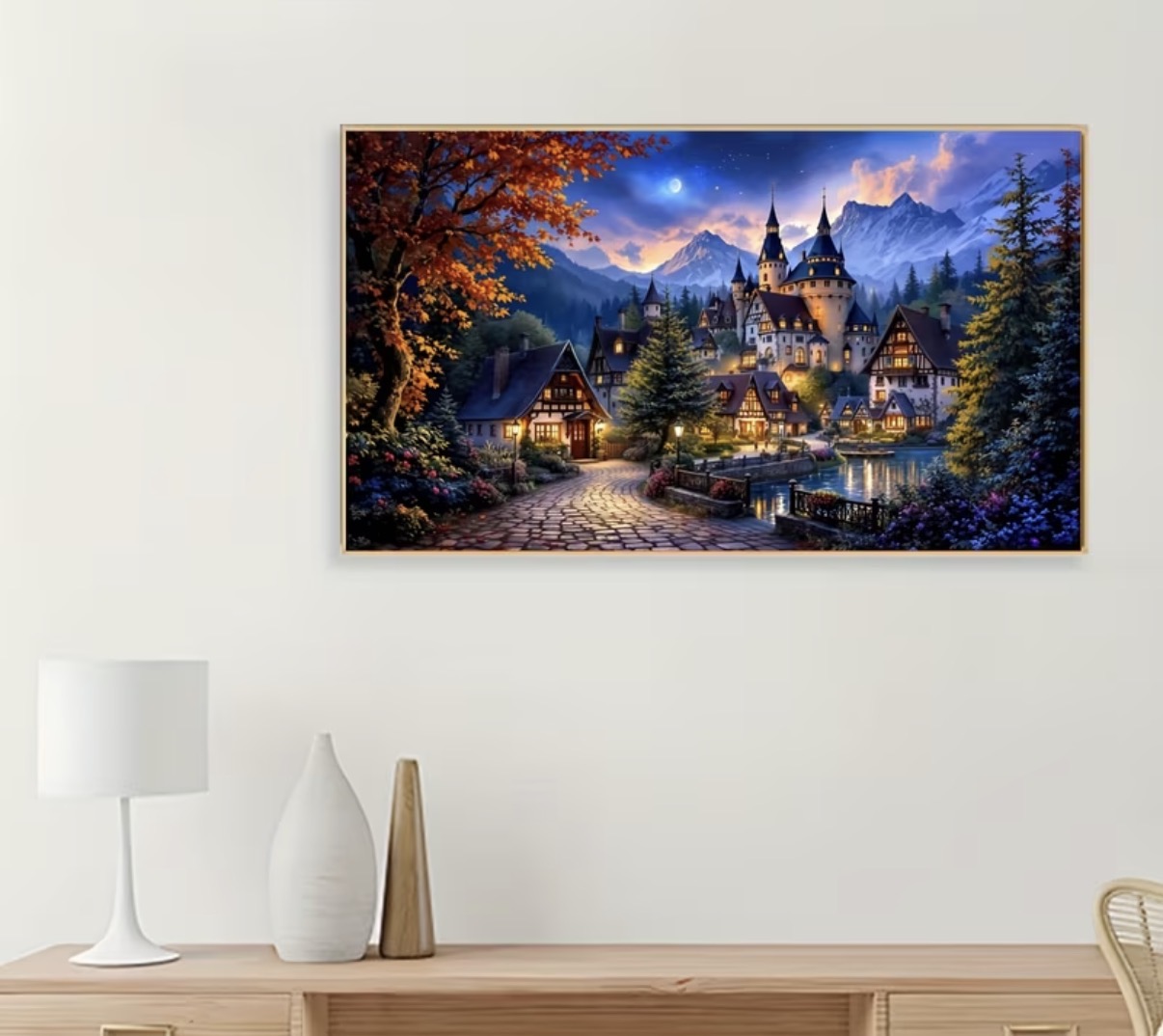 این نقاشی الماسهی خیرهکننده، منظرهای رویایی از دهکدهای افسانهای در دل طبیعت کوهستانی را به تصویر میکشد؛ خانههایی با چراغهای روشن، قلعهای باشکوه در پسزمینه، رودخانهای آرام و آسمانی شبانه با نور ماه که فضایی گرم، آرامشبخش و خیالانگیز ایجاد کرده است.