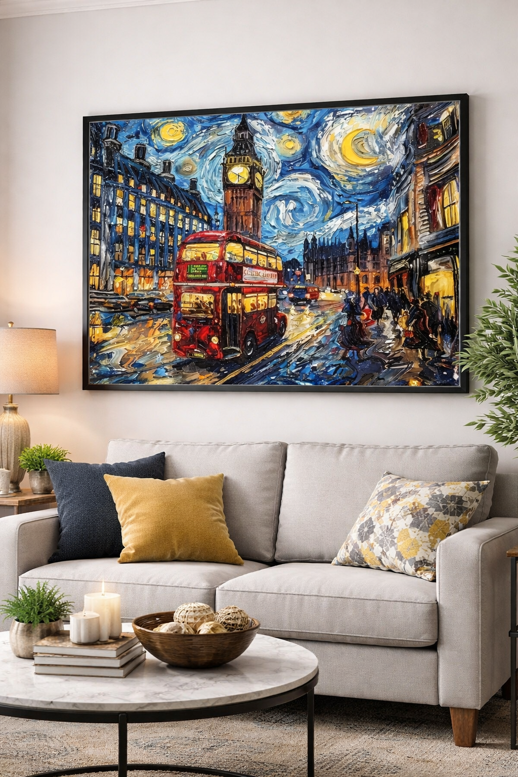 این نقاشی الماسه، ترکیبی هنرمندانه از شهر لندن و سبک نقاشی الهامگرفته از آثار کلاسیک را به تصویر میکشد؛ خیابانی زنده با اتوبوس قرمز دوطبقه لندن در کنار برج ساعت بیگبن، زیر آسمانی چرخان و پرستاره که یادآور نقاشیهای سبک ونگوگ است. انعکاس نورها روی خیابان خیس، حس پویایی، زندگی شبانه و هنر را به زیبایی منتقل میکند.