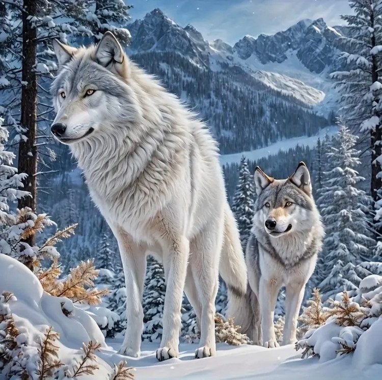 این نقاشی الماسه، تصویری باشکوه و قدرتمند از دو گرگ سپید در دل جنگلهای برفی و کوهستانی را به نمایش میگذارد. نگاه هوشیار گرگها در کنار پوشش برف، درختان کاج و کوههای بلند، حس قدرت، آزادی و آرامش طبیعت بکر را بهزیبایی منتقل میکند.