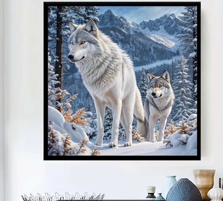 درخشش نگینهای الماسی در رنگهای سفید، طوسی و آبی سرد باعث میشود جزئیات خز گرگها و فضای زمستانی پس از تکمیل، جلوهای زنده، عمیق و بسیار چشمنواز داشته باشد.