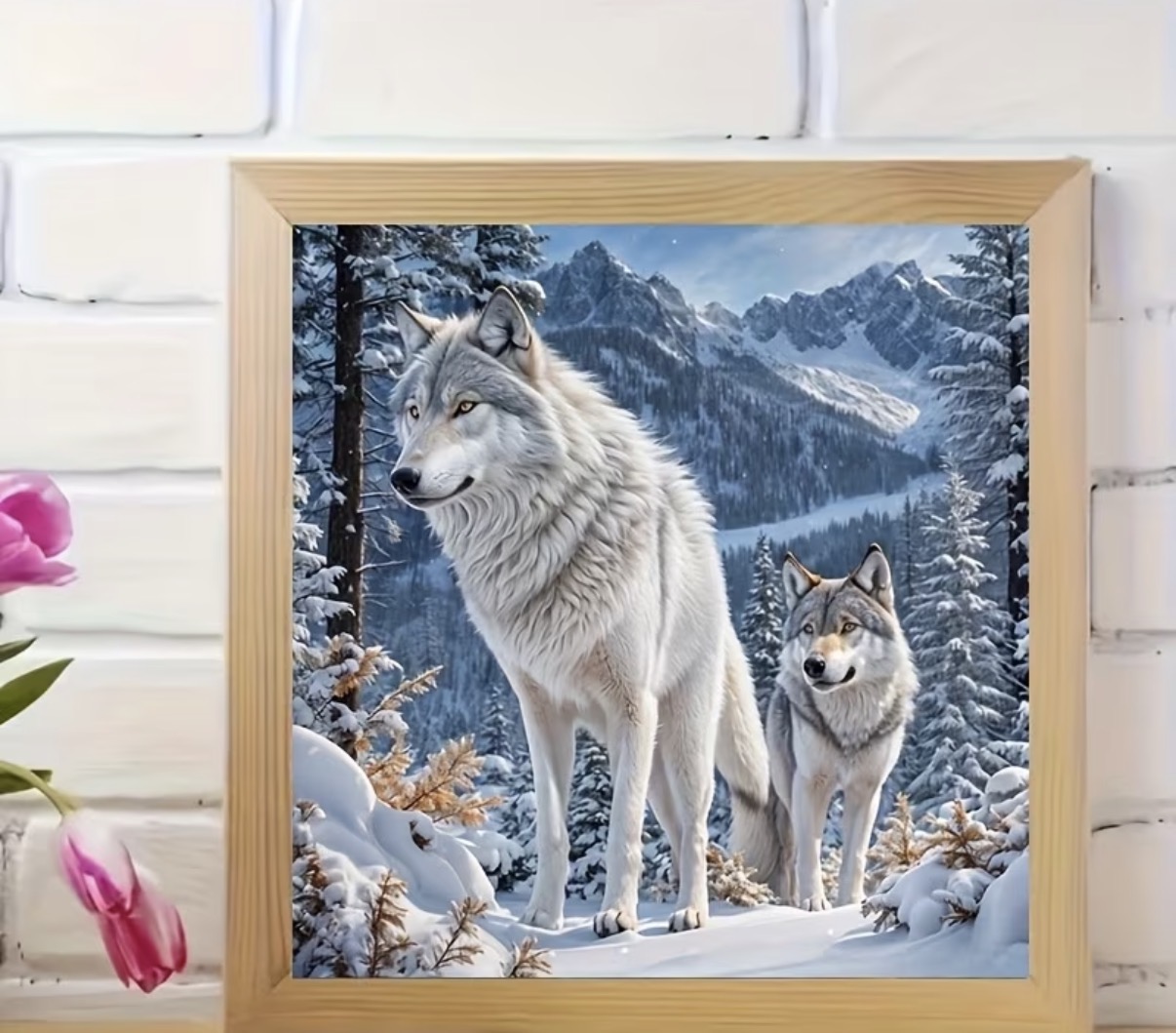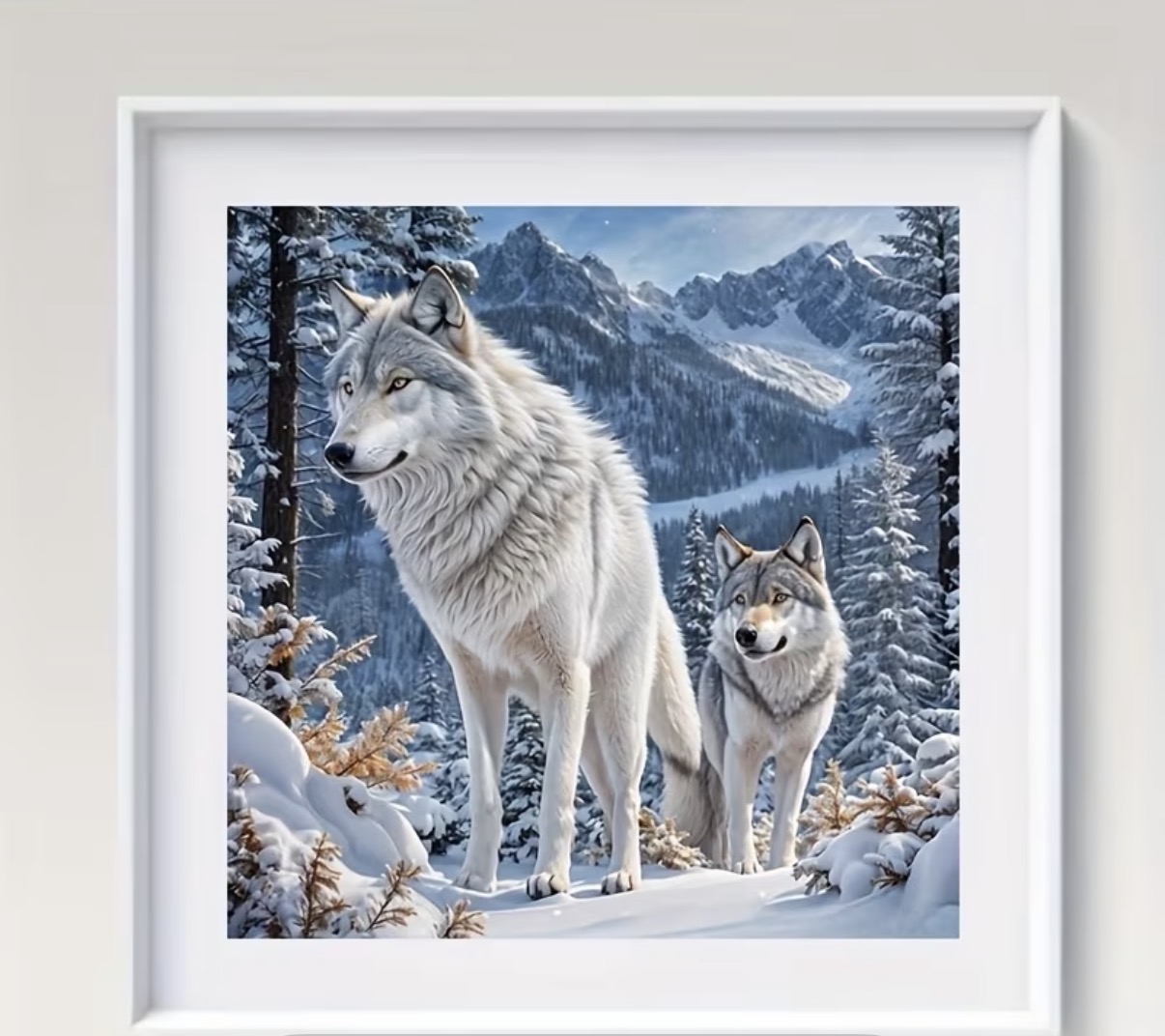 این نقاشی الماسه، تصویری باشکوه و قدرتمند از دو گرگ سپید در دل جنگلهای برفی و کوهستانی را به نمایش میگذارد. نگاه هوشیار گرگها در کنار پوشش برف، درختان کاج و کوههای بلند، حس قدرت، آزادی و آرامش طبیعت بکر را بهزیبایی منتقل میکند.