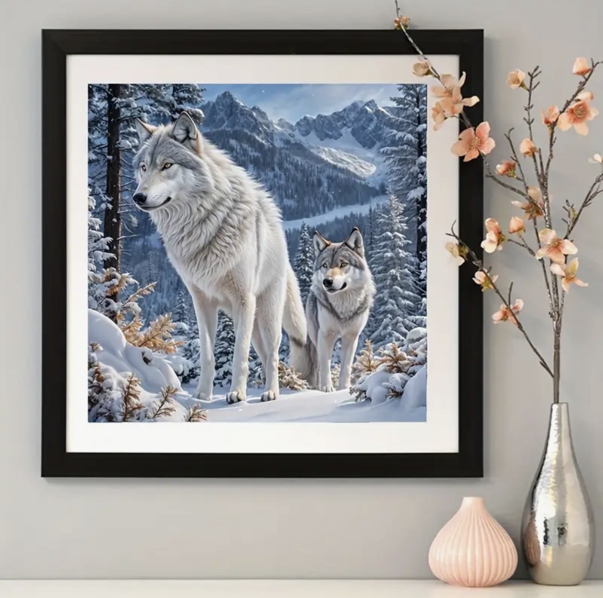 درخشش نگینهای الماسی در رنگهای سفید، طوسی و آبی سرد باعث میشود جزئیات خز گرگها و فضای زمستانی پس از تکمیل، جلوهای زنده، عمیق و بسیار چشمنواز داشته باشد.