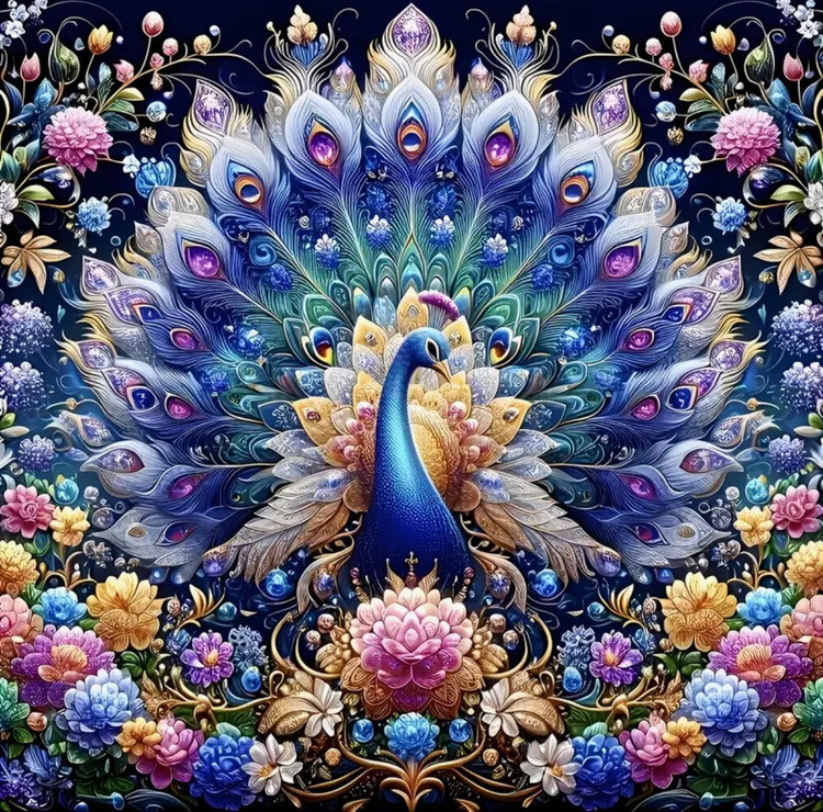 این نقاشی الماسهی خیرهکننده، تصویری بسیار مجلل از طاووسی باشکوه با پرهای گسترده و تزئینات گلدار را به نمایش میگذارد. ترکیب هنرمندانهی رنگهای آبی عمیق، فیروزهای، بنفش، طلایی و صورتی در کنار نقشونگارهای ظریف، حس شکوه، زیبایی و تجمل را بهوضوح القا میکند.