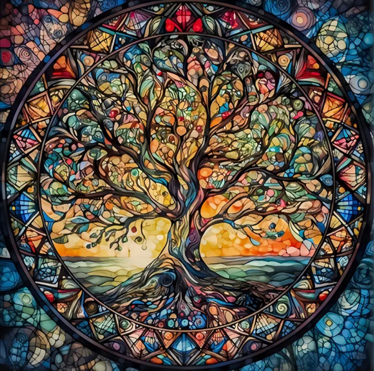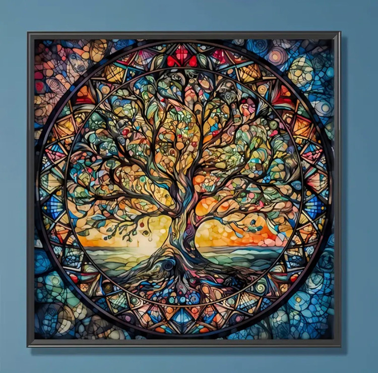این نقاشی الماسهی چشمنواز با الهام از هنر شیشههای رنگی (Stained Glass)، تصویر نمادین و عمیق درخت زندگی را به نمایش میگذارد. شاخهها و ریشههای درهمتنیدهی درخت درون یک قاب دایرهای قرار گرفتهاند که نماد تعادل، پیوستگی، رشد و انرژی حیات است.