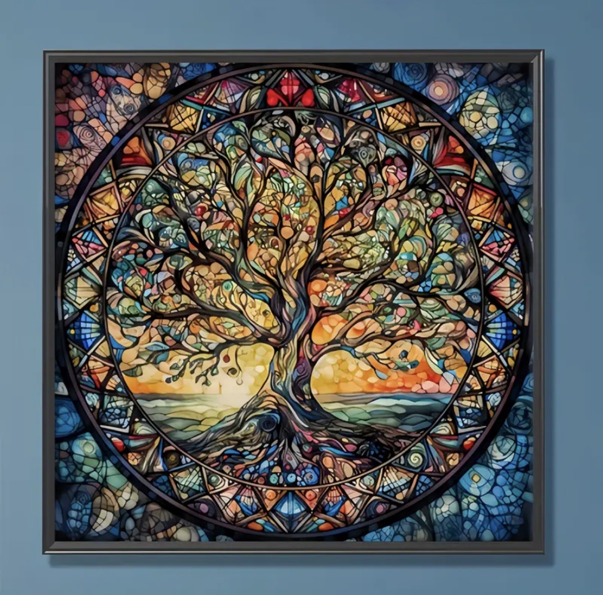 این نقاشی الماسهی چشمنواز با الهام از هنر شیشههای رنگی (Stained Glass)، تصویر نمادین و عمیق درخت زندگی را به نمایش میگذارد. شاخهها و ریشههای درهمتنیدهی درخت درون یک قاب دایرهای قرار گرفتهاند که نماد تعادل، پیوستگی، رشد و انرژی حیات است.