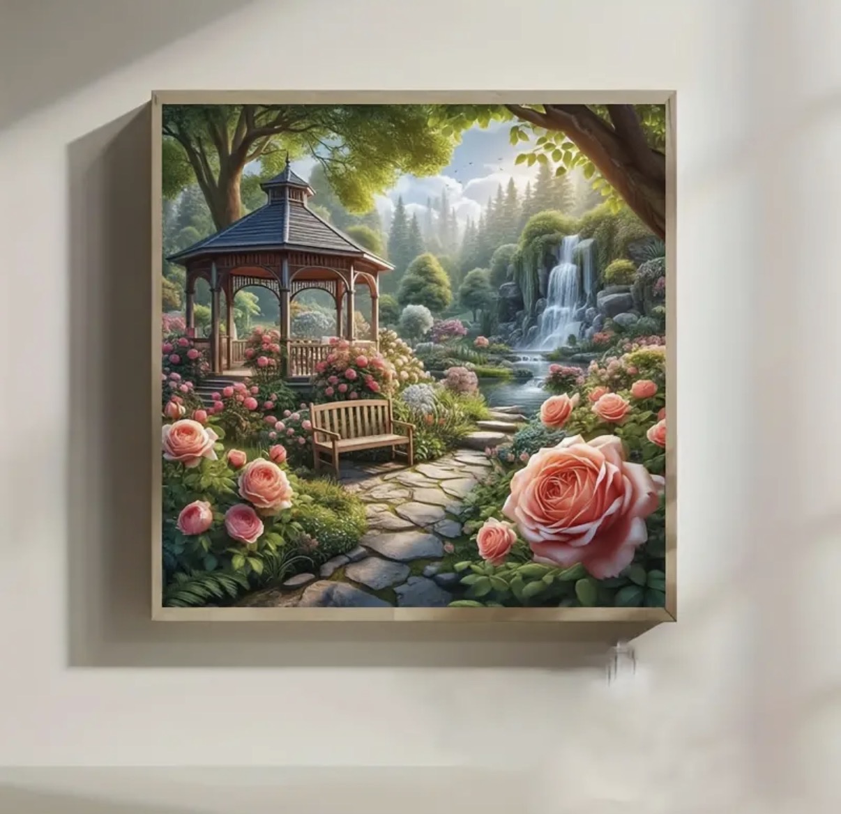 این نقاشی الماسهی لطیف و آرامشبخش، صحنهای رؤیایی از یک باغ سرسبز و عاشقانه را به تصویر میکشد؛ جایی که آلاچیق چوبی کلاسیک در میان گلهای رز صورتی، مسیر سنگی ظریف و آبشاری زلال قرار گرفته است. ترکیب طبیعت، آب، گل و نور، حس آرامش، تازگی و خیالانگیزی را به بیننده منتقل میکند.
