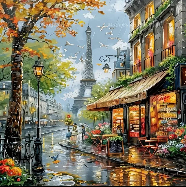 یک طرح رویایی از برج ایفل، خیابانهای خیس پاییزی و کافهی گرم فرانسوی که با چسباندن الماسهای رنگی روی بوم، به اثری درخشان و سهبعدی تبدیل میشه.