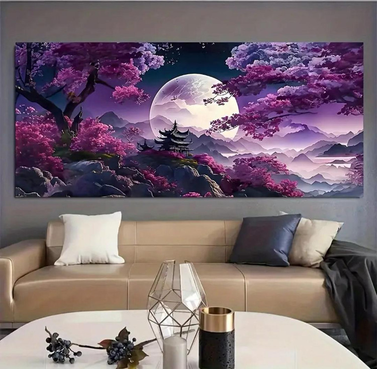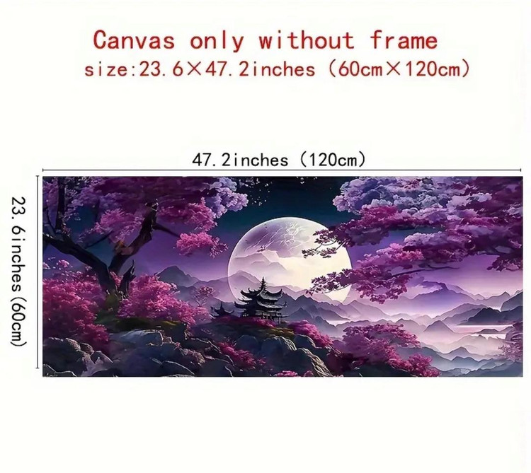 این یک تابلو نقاشی الماسی با طرحی رویایی از ماه کامل و درختان شکوفه بنفش هست. روی بوم مخصوص (Canvas) به ابعاد ۶۰×۱۲۰ سانتیمتر چاپ شده و به صورت خام (بدون قاب) ارائه میشه. شما با چسباندن الماسهای رنگی روی بوم، طرح رو کامل میکنید و در پایان یک اثر درخشان و هنری خواهید داشت که میتونه برای دکور خونه یا حتی هدیه انتخاب خیلی خاصی باشه