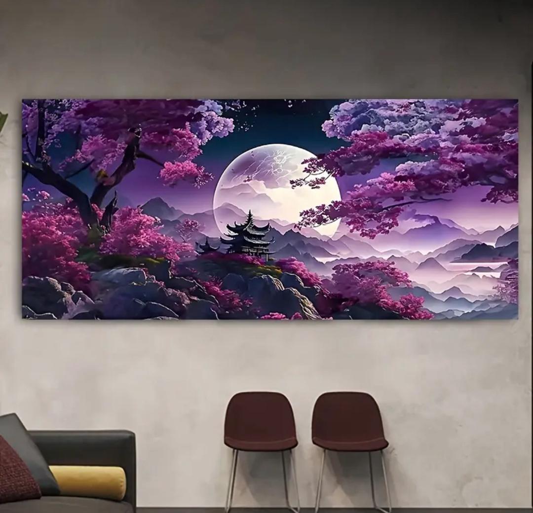 این یک تابلو نقاشی الماسی با طرحی رویایی از ماه کامل و درختان شکوفه بنفش هست. روی بوم مخصوص (Canvas) به ابعاد ۶۰×۱۲۰ سانتیمتر چاپ شده و به صورت خام (بدون قاب) ارائه میشه. شما با چسباندن الماسهای رنگی روی بوم، طرح رو کامل میکنید و در پایان یک اثر درخشان و هنری خواهید داشت که میتونه برای دکور خونه یا حتی هدیه انتخاب خیلی خاصی باشه