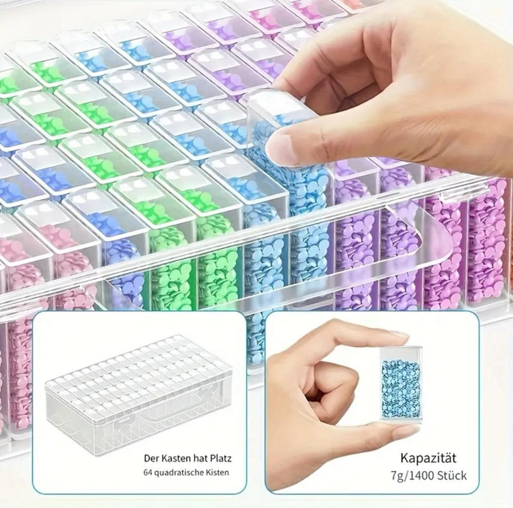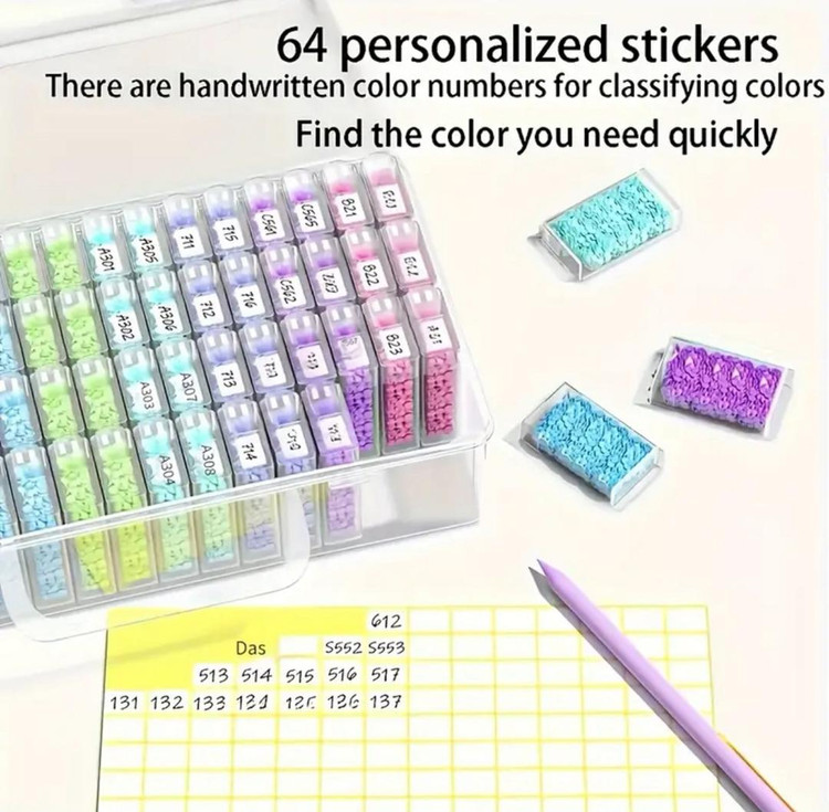 این محصول یک جعبه سازماندهی حرفهای با 64 خانه جداگانه است که مخصوص مرتبسازی و نگهداری الماسهای نقاشی الماسی طراحی شده. هر خانه درب جداگانه دارد و مانع از مخلوط شدن یا ریختن الماسها میشود.