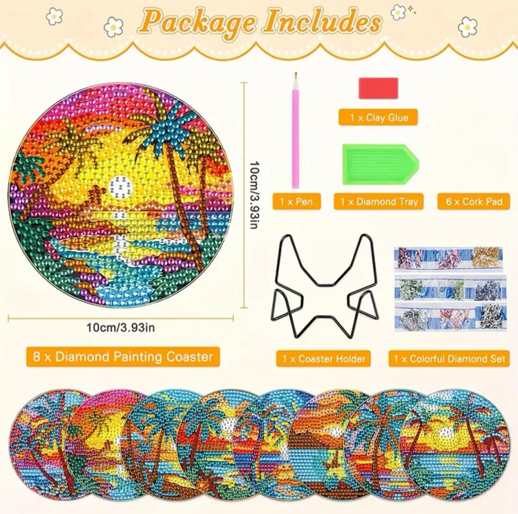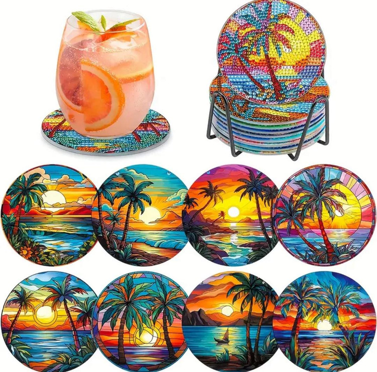 این محصول یک ست زیرلیوانی نقاشی الماسی با طرحهای زیبا و رنگارنگ از غروب و نخلهای ساحلی است. زیرلیوانیها به صورت خام ارائه میشوند و شما باید با چسباندن الماسهای رنگی روی الگو، طرح را تکمیل کنید.