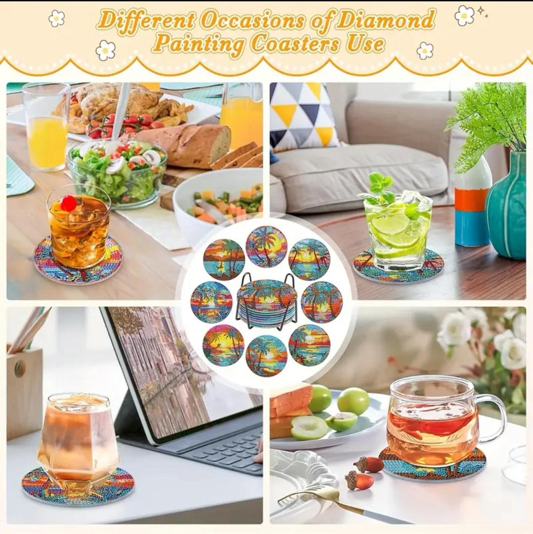 این محصول یک ست زیرلیوانی نقاشی الماسی با طرحهای زیبا و رنگارنگ از غروب و نخلهای ساحلی است. زیرلیوانیها به صورت خام ارائه میشوند و شما باید با چسباندن الماسهای رنگی روی الگو، طرح را تکمیل کنید.