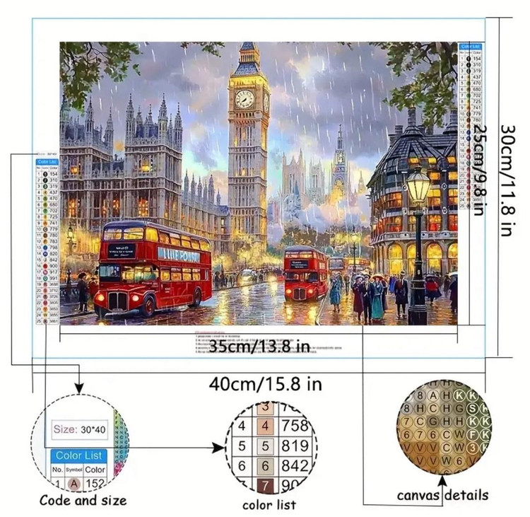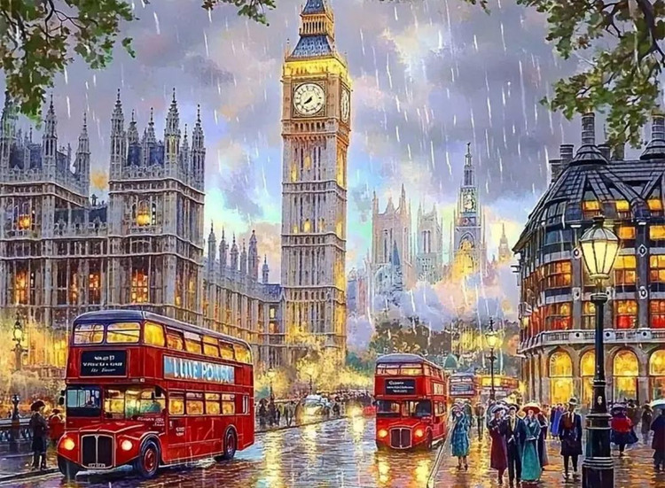 با این نقاشی الماسی زیبا، لندن رویایی را با دستان خودتان خلق کنید! این طرح خیرهکننده نمایی از برج بیگبن، خیابانهای بارانی و اتوبوسهای قرمز کلاسیک لندن را به تصویر میکشد و حس آرامش و زیبایی خاصی را به فضای خانه شما میآورد.
