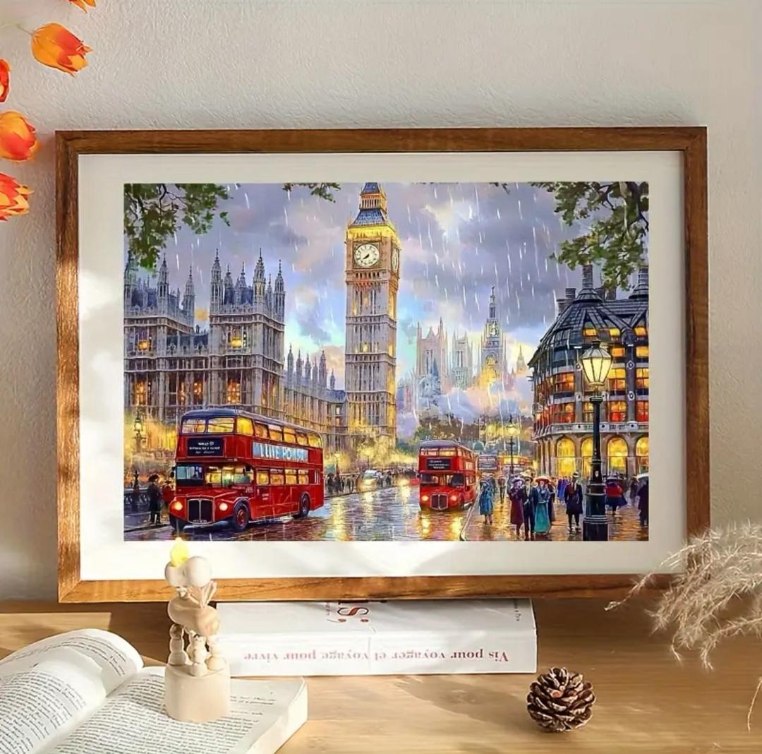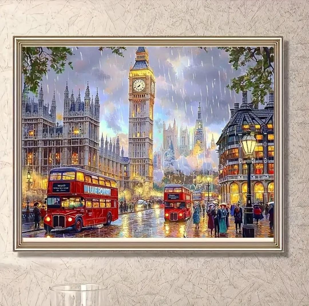 با این نقاشی الماسی زیبا، لندن رویایی را با دستان خودتان خلق کنید! این طرح خیرهکننده نمایی از برج بیگبن، خیابانهای بارانی و اتوبوسهای قرمز کلاسیک لندن را به تصویر میکشد و حس آرامش و زیبایی خاصی را به فضای خانه شما میآورد.