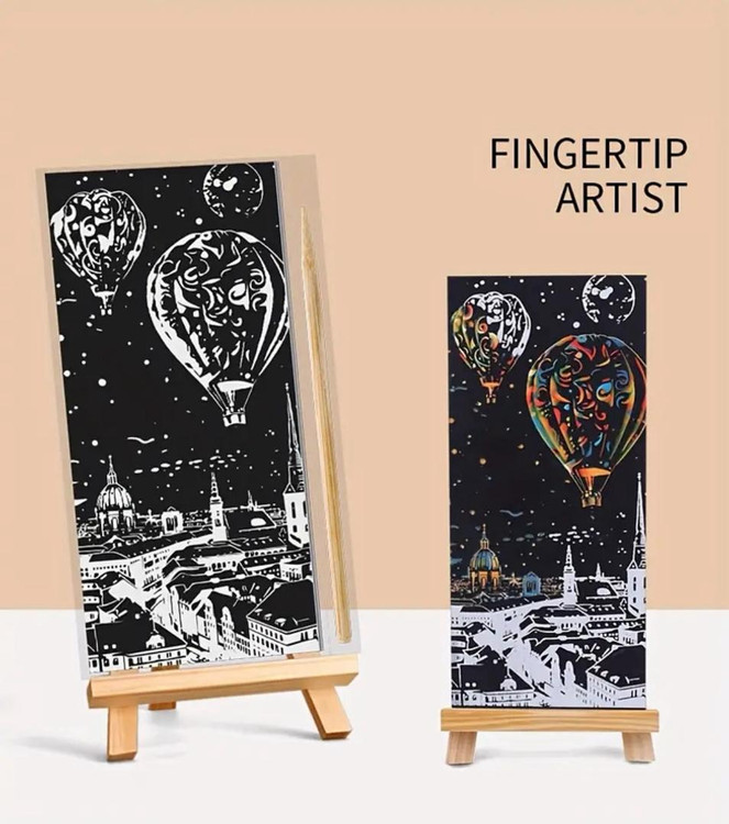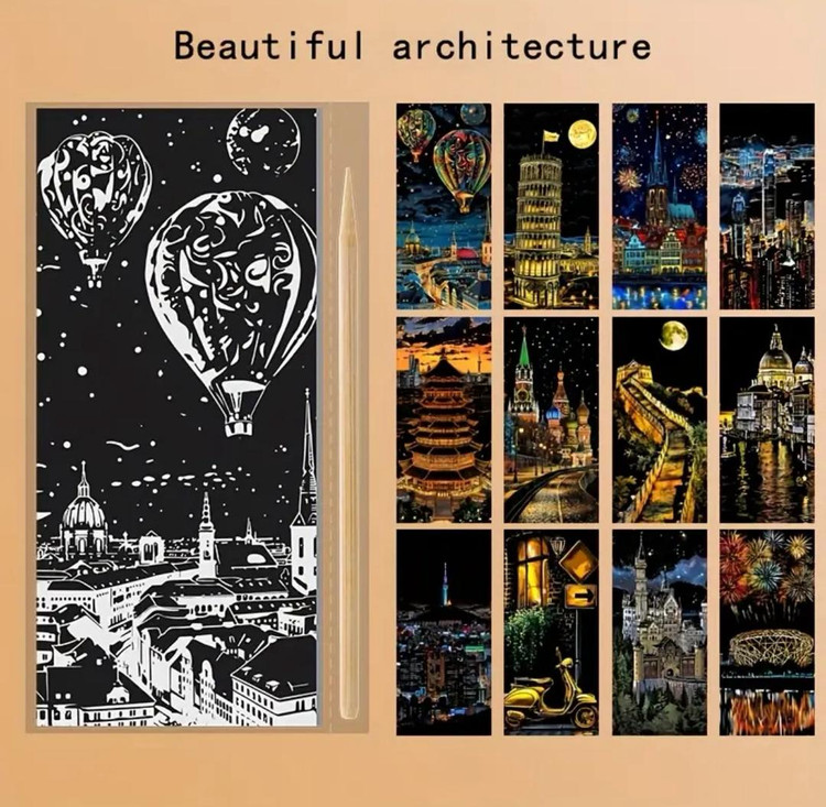 با این کیت هنری فوقالعاده، بناهای مشهور و معماریهای شگفتانگیز جهان را با دستان خودتان خلق کنید! کافیست لایهی مشکی سطح بوم را با ابزار مخصوص بتراشید تا رنگهای درخشان و چشمگیر نمایان شوند.