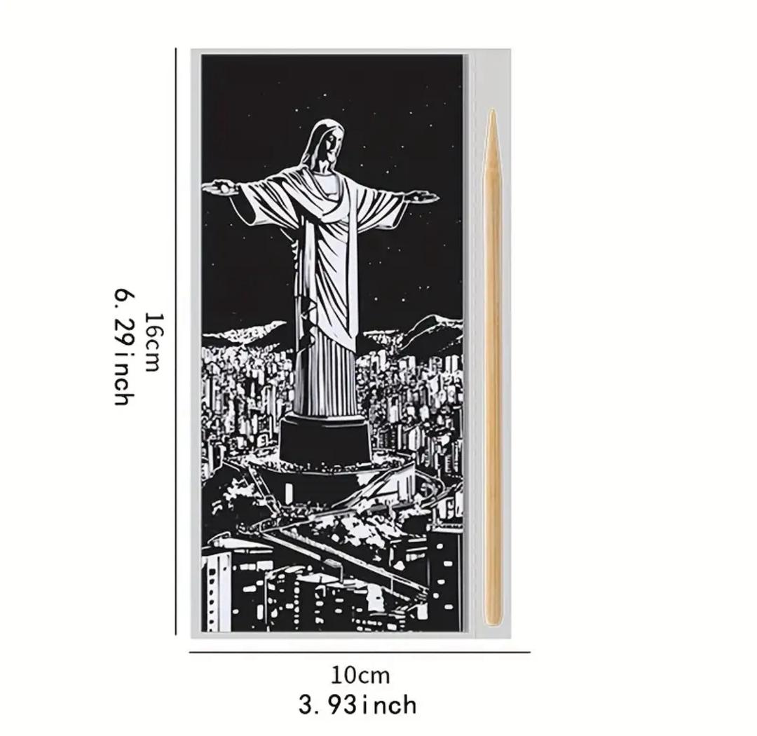 با این کیت هنری فوقالعاده، بناهای مشهور و معماریهای شگفتانگیز جهان را با دستان خودتان خلق کنید! کافیست لایهی مشکی سطح بوم را با ابزار مخصوص بتراشید تا رنگهای درخشان و چشمگیر نمایان شوند.