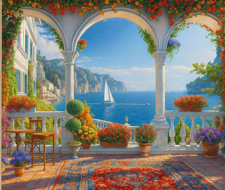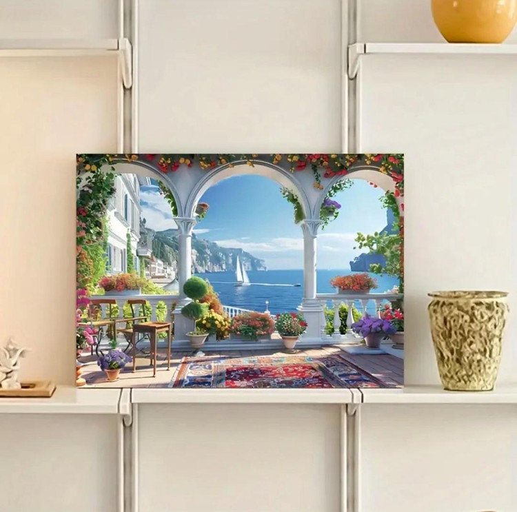 با این کیت نقاشی با اعداد، شما میتونید یک اثر هنری رویایی خلق کنید. تصویری از تراسی پر از گلهای رنگارنگ با چشماندازی شگفتانگیز از دریا، قایق بادبانی و صخرههای زیبا که حالوهوای مدیترانهای را به خانهی شما میآورد.