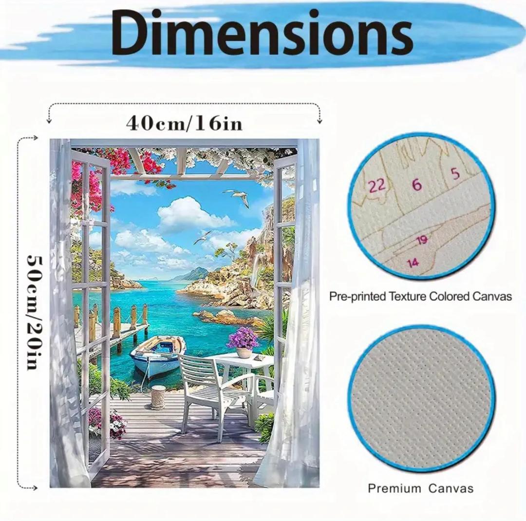 با این کیت نقاشی با اعداد، شما میتونید یک تابلو هنری بینظیر خلق کنید؛ تصویری از یک ایوان ساحلی با چشمانداز دریا، قایق کوچک، صخرههای طبیعی و پرندگان در آسمان آبی.
